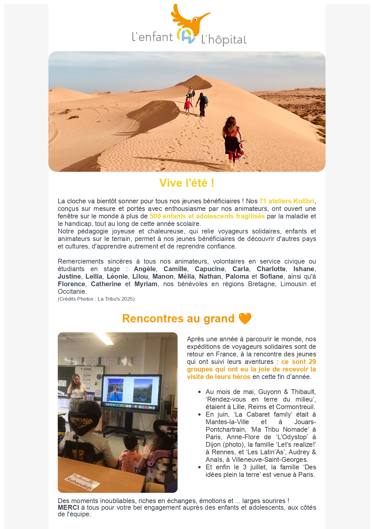 La cloche va bientôt sonner pour tous nos jeunes bénéficiaires ! Nos 71 ateliers Kolibri, conçus sur mesure et portés avec enthousiasme par nos animateurs, ont ouvert une fenêtre sur le monde à plus de 500 enfants et adolescents fragilisés par la maladie et le handicap, tout au long de cette année scolaire.